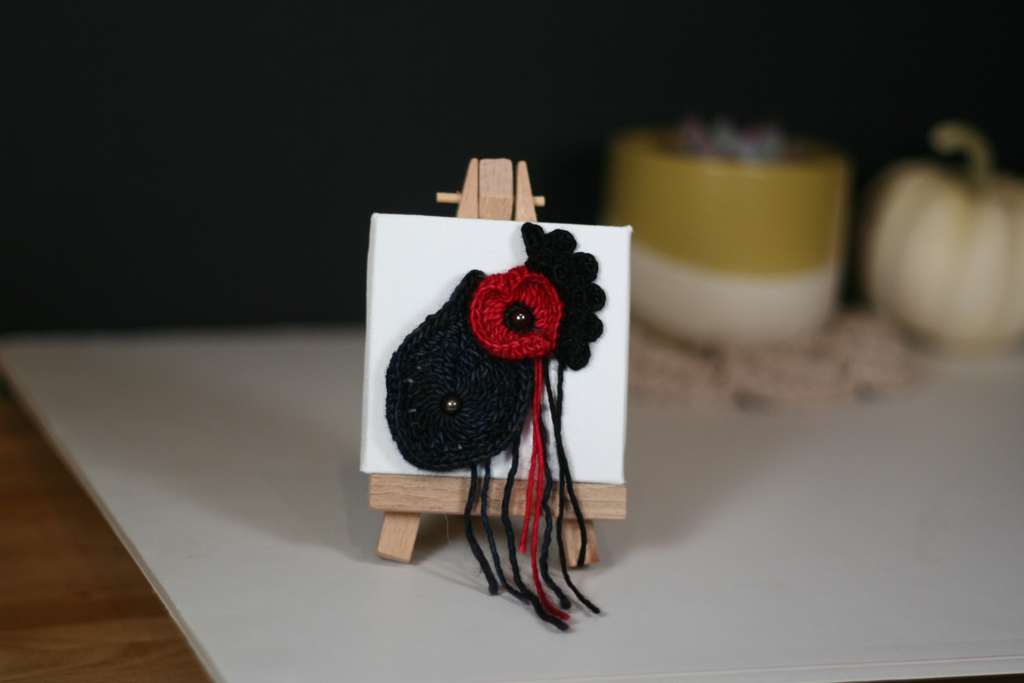 Freeform crochet art piece with flower, leaf, and raindrop elements.